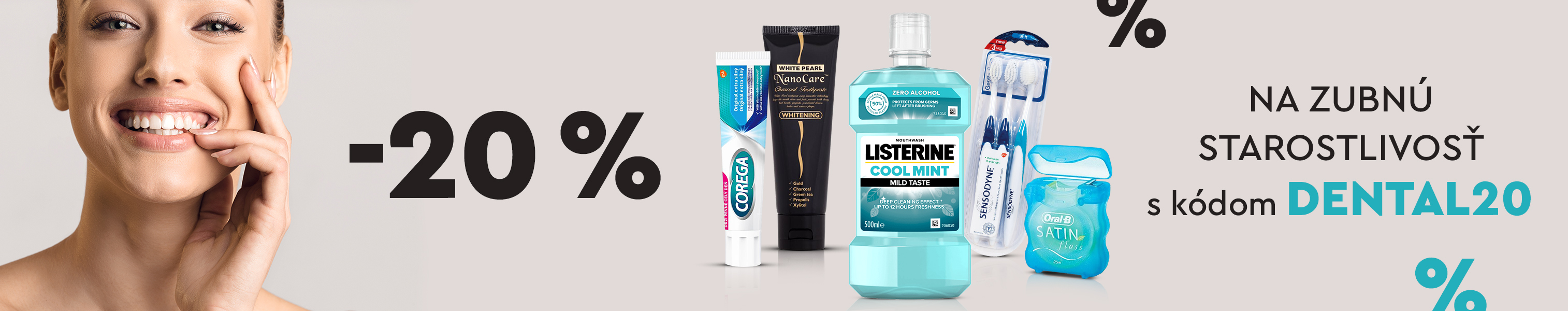 Získajte zľavu 20 % k nákupu zubnej starostlivosti vybraných značiek. Zadajte kód DENTAL20 v prvom kroku nákupného košíka a zľava je vaša! Akcia platí od 12. 3. do 25. 3. 2024. Zľavový kód je možné uplatniť iba na e-shopu www.parfemy-elnino.sk.