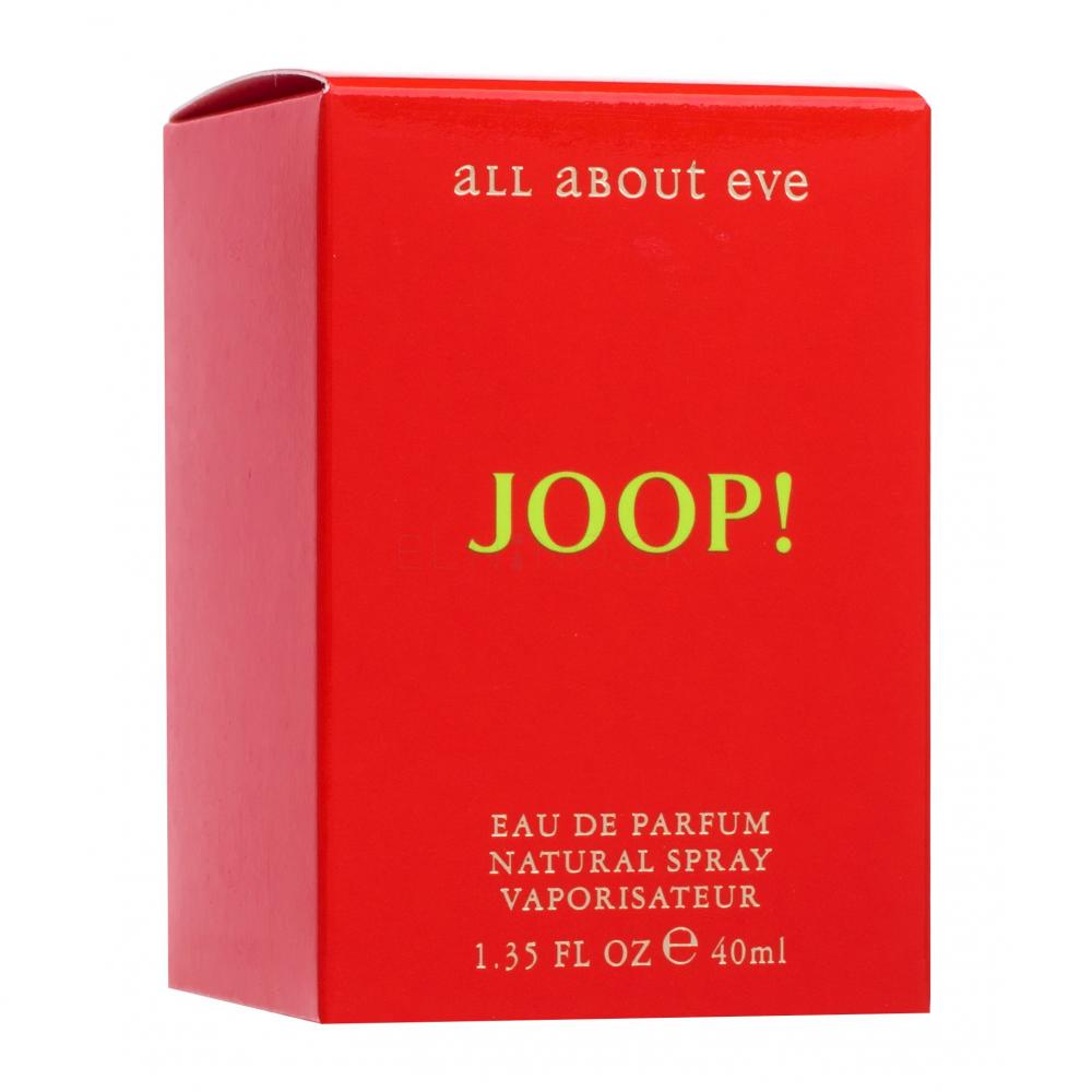 Joop All about Eve mi připomíná odpočinkový čas v tiché cukrárně, kde voní jablečný závin se skořicí, posypaný vanilkovým cukrem, k němu jablečný džus... Samozřejmě je to napsáno s nadsázkou.:-) Vůni šťavnatého jablka zklidní a pohladí bílé květy jasmínu a konvalinek, poté fialové květy heliotropinu, závěrečný jemně výraznější projev přednese vanilka se santalem. Vcelku lehká kompozice jemně gurmánského parfému, rozuměj parfémované vody. Vnímám jí jako nekonfliktní a pro milovnice netěžkých vůní přijatelnou volbu.:-)