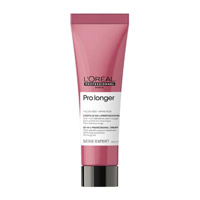 Termoochranný krém L'Oréal Professionnel Pro Longer 10-In-1 Professional Cream poskytuje vlasom ochranu pred teplom do 230 ° C a zároveň ich posilňuje a vyživuje.