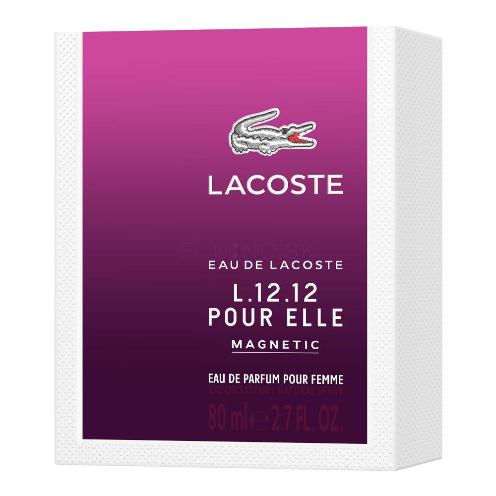 Parfum Lacoste Eau de Lacoste L.12.12 Pour Elle Magnetic je jedinečná francúzska vôňa pre jedinečnú ženu. Zdôrazní váš pôvab a podporí sebavedomie počas celého dňa — v kancelárii, po fitness aktivitách, v kaviarni aj na večierku. Pôsobivá je aj jej temne fialová fľaštička s krokodílom Lacoste. Dámska parfumovaná voda Lacoste Eau de Lacoste L.12.12 Pour Elle Magnetic uzrela svetlo sveta v roku 2016.