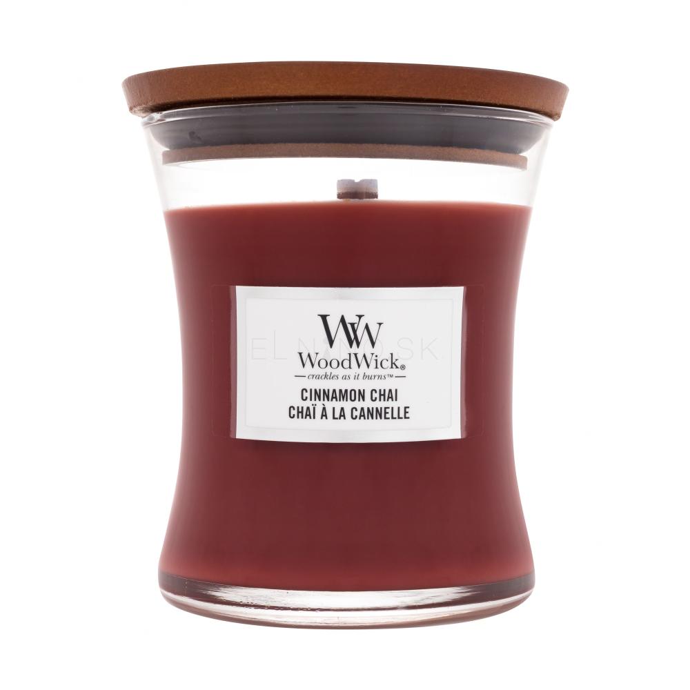 Vonná sviečka WoodWick Cinnamon Chai je vyrobená zo zmesi prémiového parafínu a sójového vosku s vysoko koncentrovanými vôňami. Inovatívny prírodný drevený knôt Pluswick® Innovation vytvára upokojujúci zvuk praskajúceho ohňa.